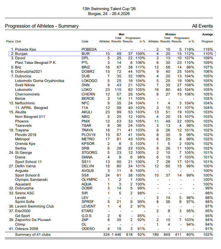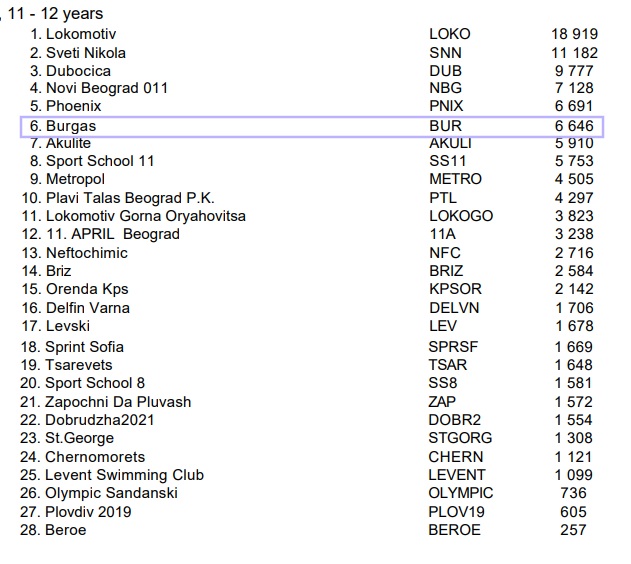 Само с един медал, но с престижно класиране при 11-12 годишните завърши за КВС „БУРГАС“ 13-тото издание на Международния турнир Swimming Talent cup, който се проведе на басейн „Парк Арена“ в гр. Бургас.